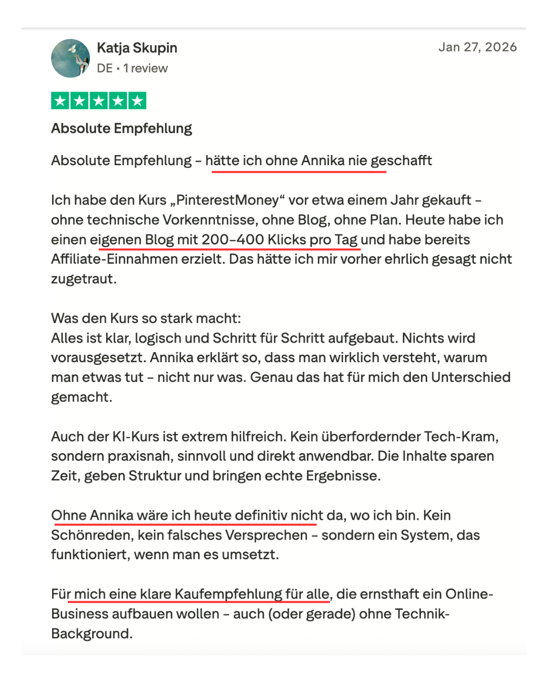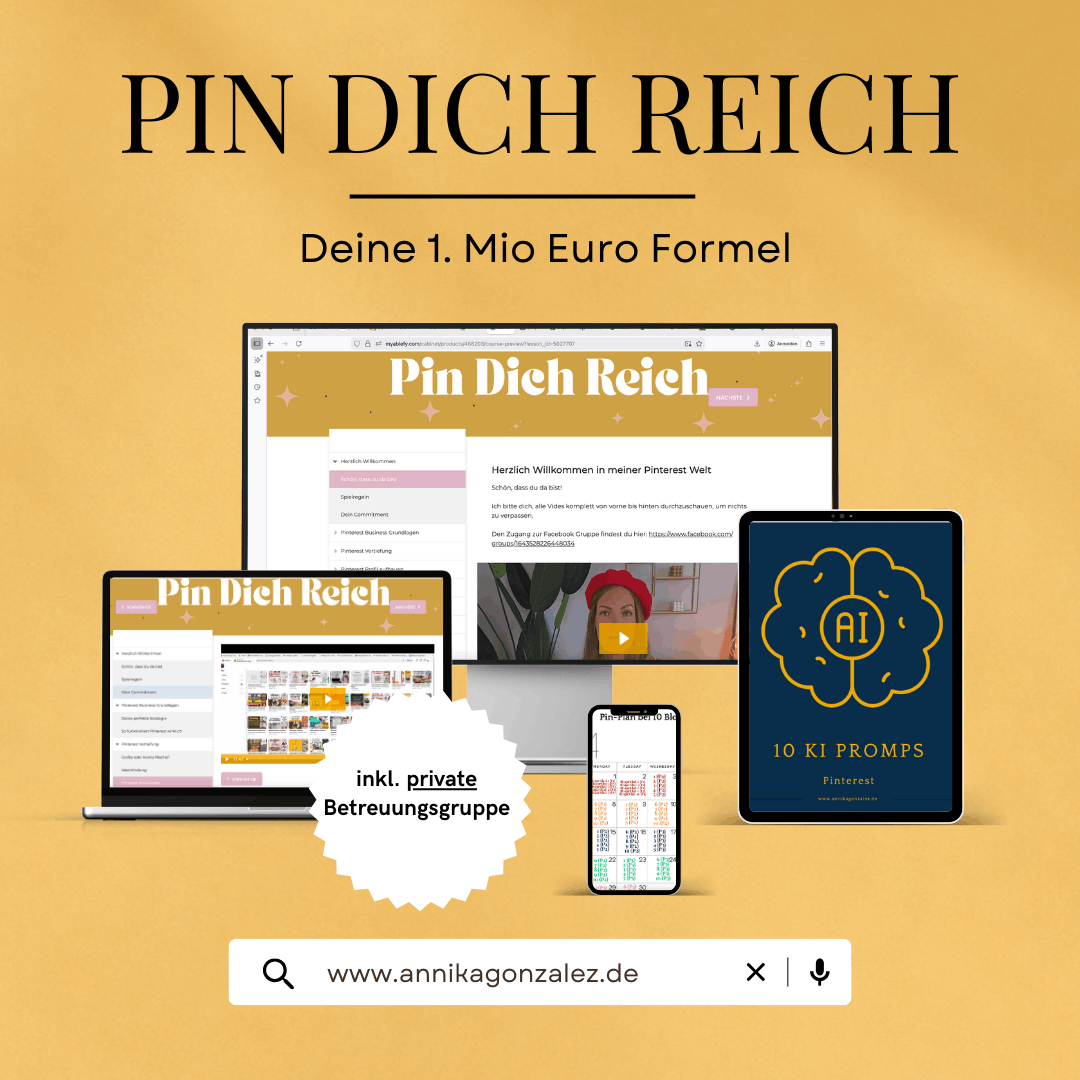 Du lernst, wie du eine profitable Idee findest, einen Blog aufbaust, Pinterest strategisch für Reichweite nutzt, E-Mail-Marketing einsetzt, die steuerlichen Grundlagen verstehst und dir in der Facebook-Gruppe Unterstützung auf deinem Weg holst.