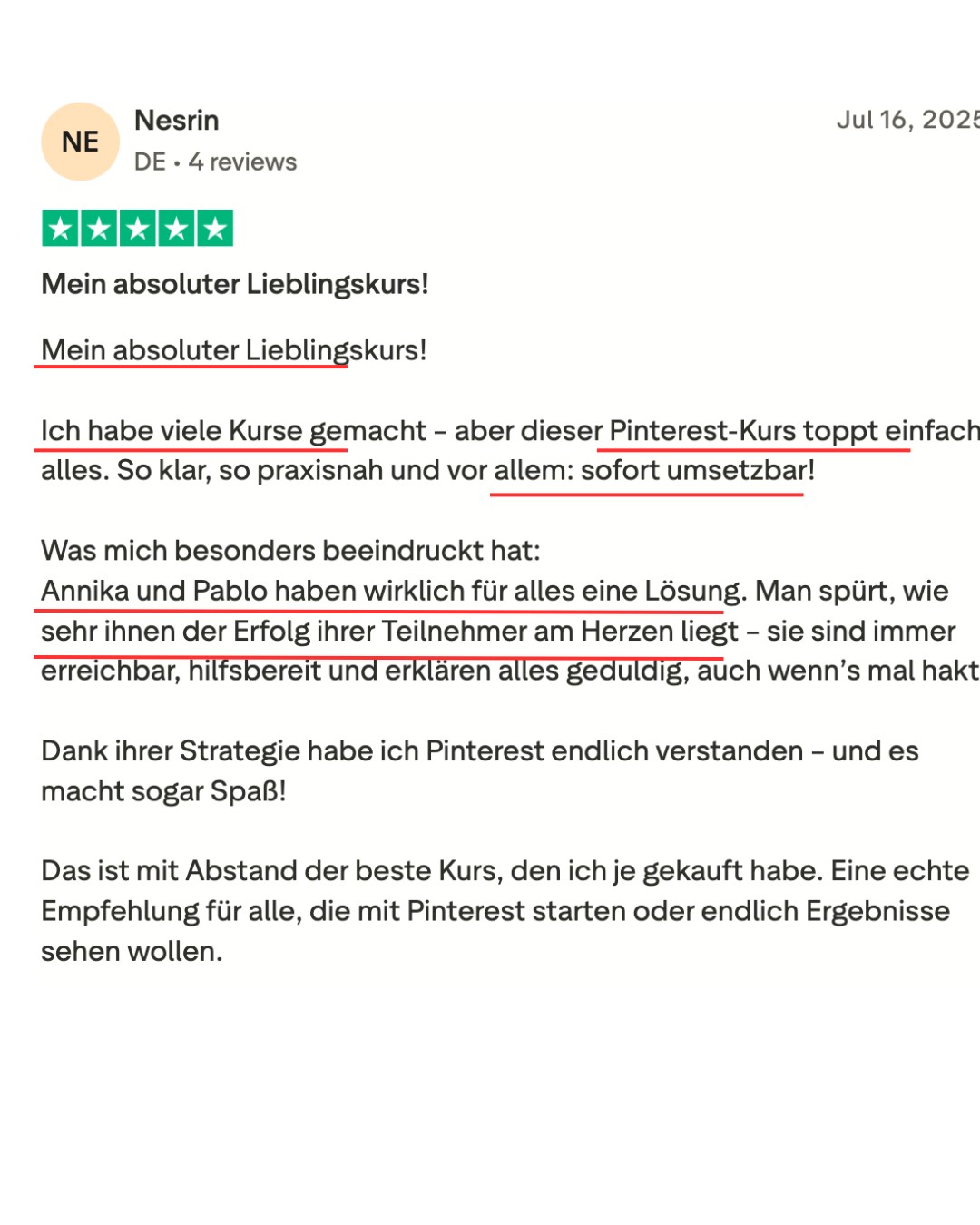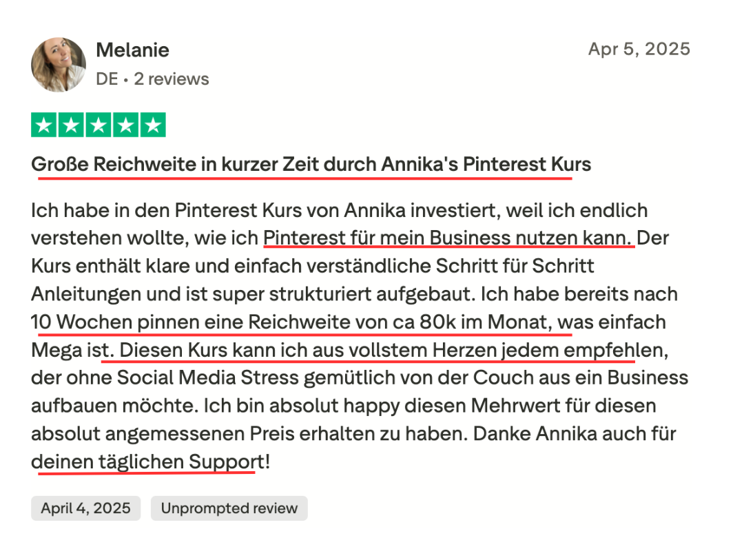 • Du hast endlich einen klaren Plan statt Chaos – und verstehst, was auf Pinterest wirklich funktioniert.